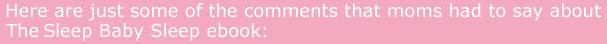 "I really want to thank you for writing the Sleep Baby Sleep eBook...This is JUST the information I needed... I will definitely continue with the Sleep Baby Sleep method as long as it takes to get my baby to sleep through the night, AND will definitely recommend to ALL my friends."
